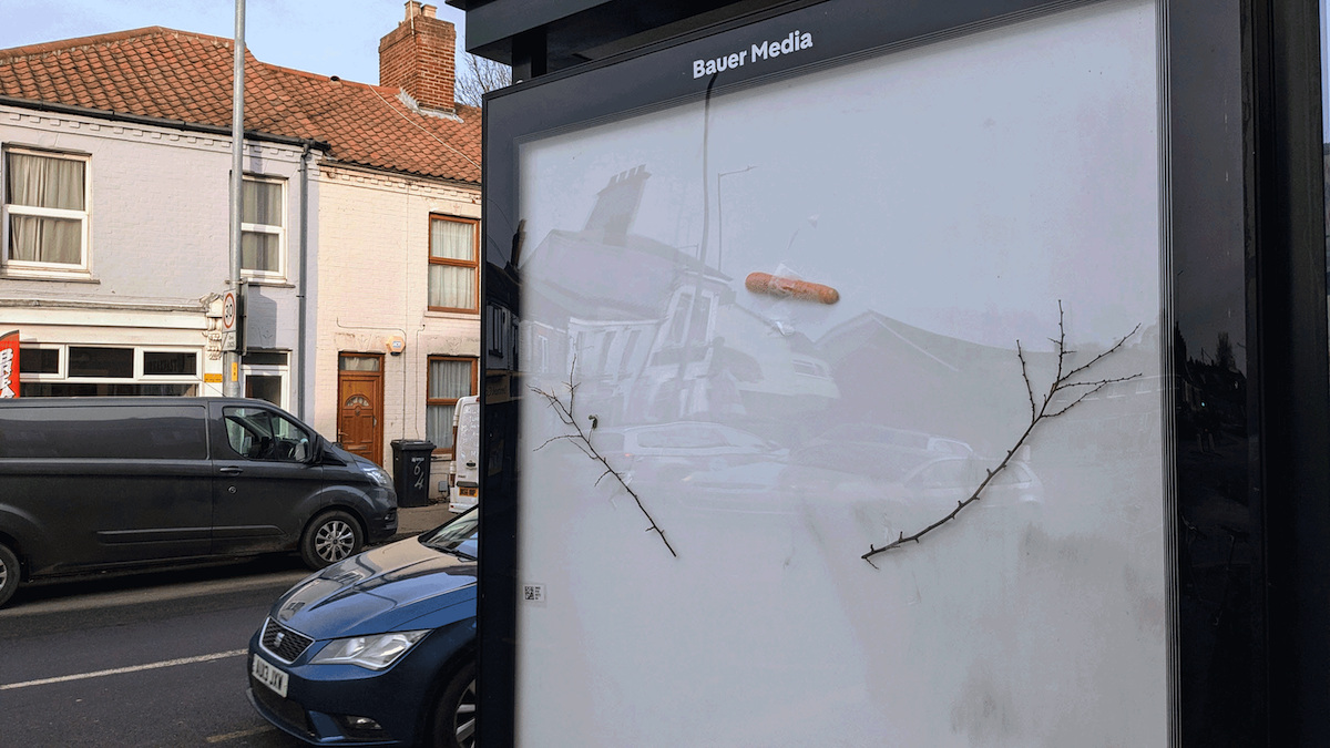 We constructed a minimalist snowman from a real carrot and two branches foraged from a recently-trimmed blackthorn hedge. The title 'Snow Business' plays on the dual meaning that such a silly, non-commercial gesture has 'no business' in a space strictly reserved for advertising, while also declaring our reclamation of this…