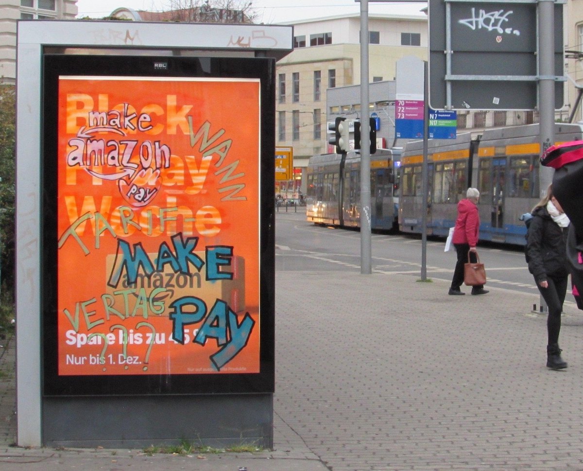 News Coverage: - https://www.l-iz.de/wirtschaft/verbraucher/2025/11/kritik-zur-black-week-adbusting-kampagne-amazon-640187- https://www.jungewelt.de/artikel/513135.zum-black-friday-arbeiten-bis-zum-umfallen.html?sstr=amazon- https://www.labournet.de/internationales/streiks-und-proteste-von-black-friday-28-november-bis-cyber-monday-1-dezember-2025-die-techno-autoritaere-dystopie-von-amazon-muss-gestoppt-werden/ Deutsche Version: siehe unten On the occasion of the biggest consumer and advertising spectacle of the year, Black Friday, activists hung posters criticising Amazon in Leipzig's advertising display cases. At Leipzig's consuming hotspot, the Höfe am Brühl, passers-by saw homemade posters with anti-capitalist slogans…