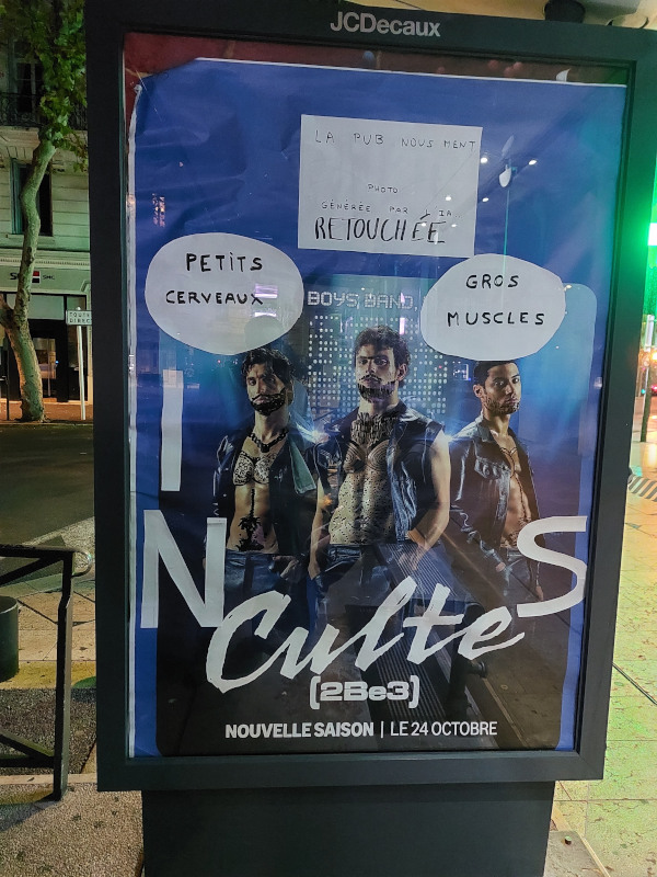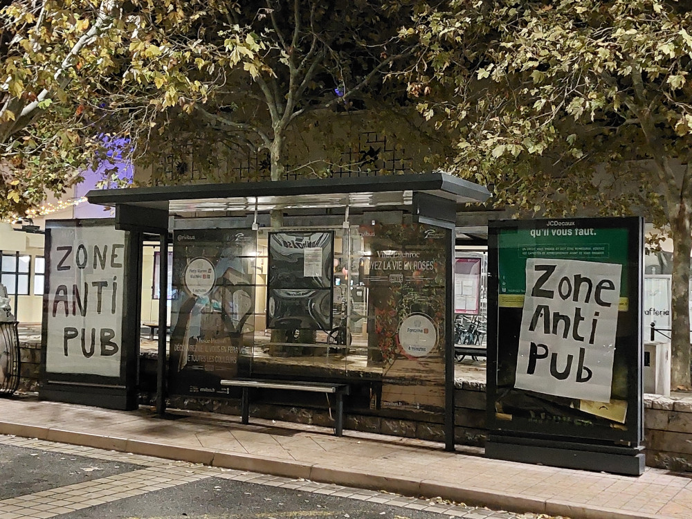 In the city center, a poster for a boy’s band was altered, and some posters were covered with the message “No Advertising Zone / Zone Anti Pub”.