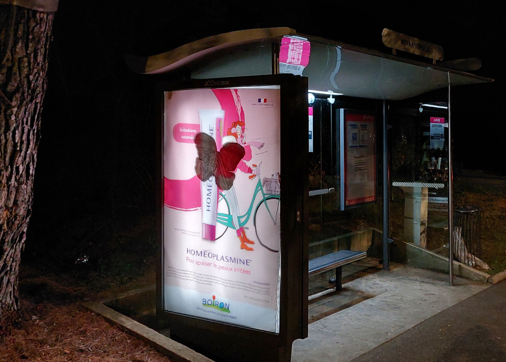 On the outskirts, where there are more illuminated billboards, posters were decorated with butterflies to denounce the effect of the light from these advertising sites on nocturnal wildlife. The coastal strip of the Alpes-Maritimes is a beautiful region that deserves better than the defacement and trivialization of omnipresent advertising.