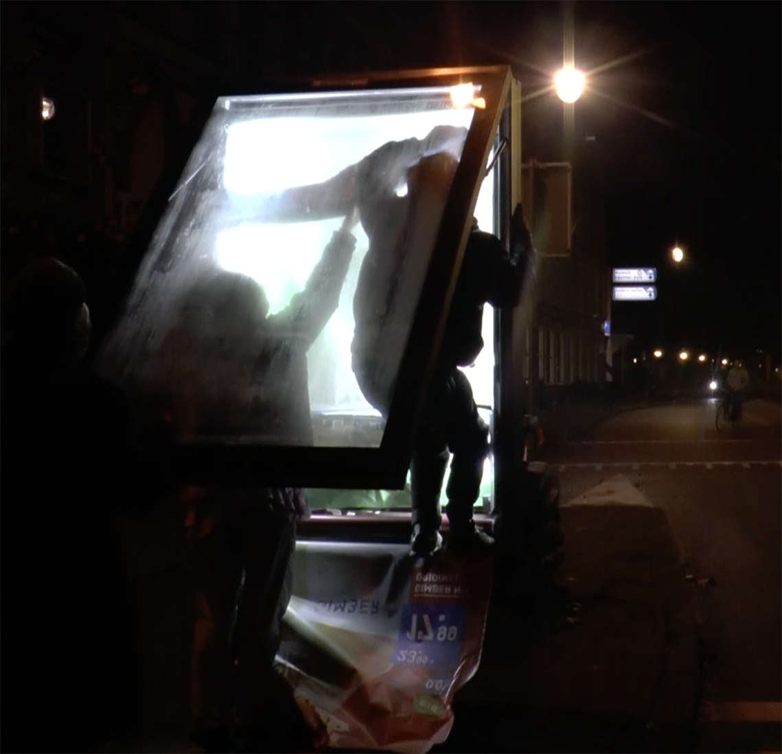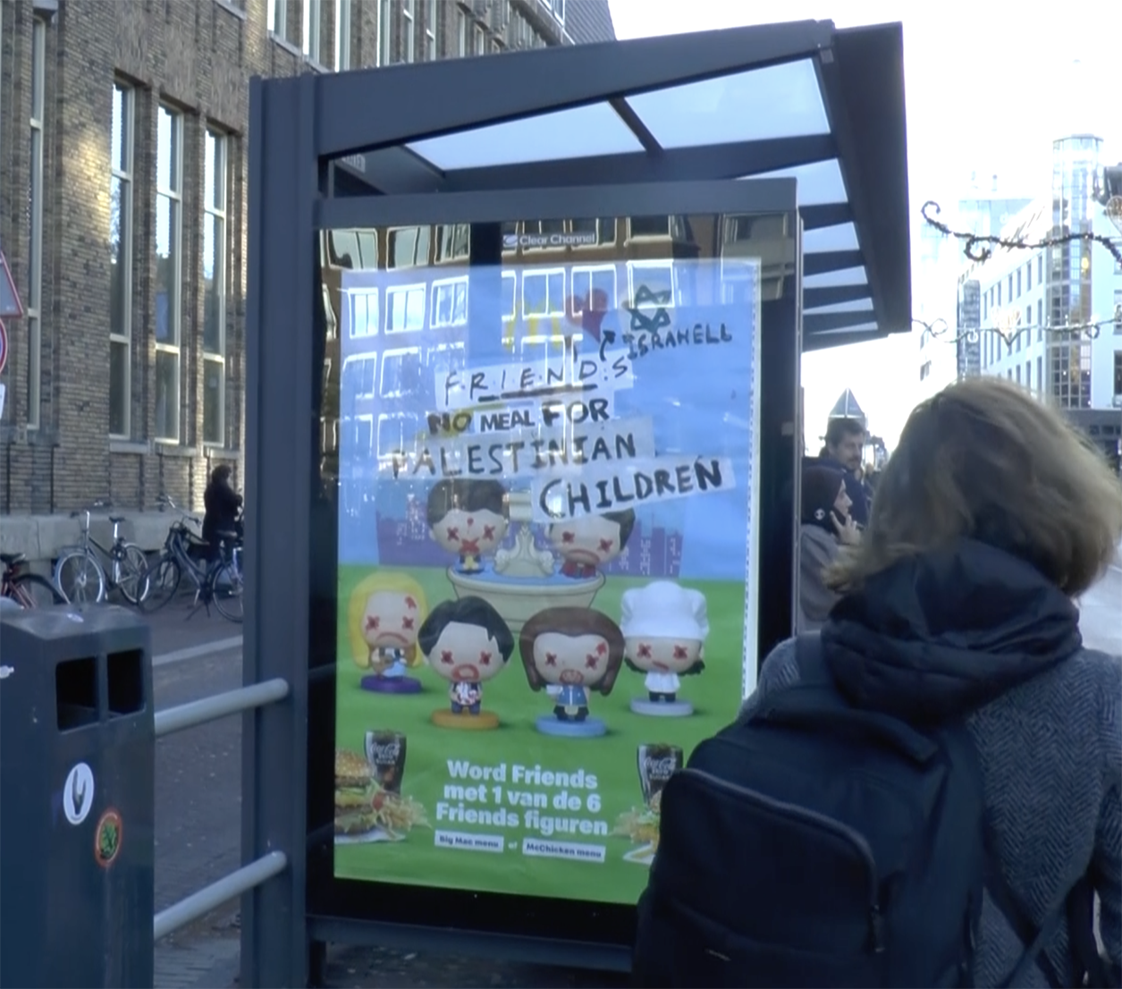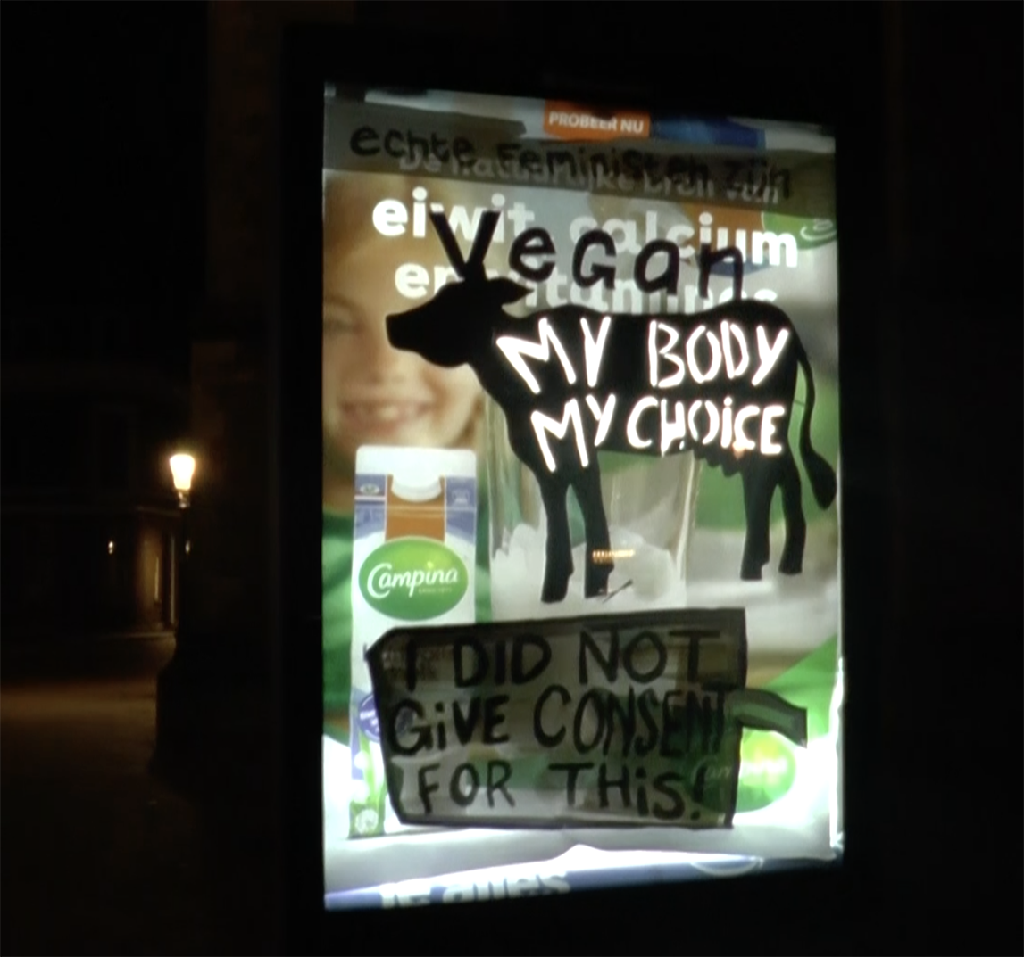 This action was taken as an act against consumerism. During 14-28 in Utrecht in the Netherlands, about 80 advertisements have been taken out; the video shows about 56 of them with replacements. This replacement contains political content, confronting companies on genocide, confronting them on animal abuse, confronting them on consumerism, and confronting them on children’s indoctrination. It’s an act of reclaiming the public space and giving more visibility to the horror of the killer companies that systematically starve and abuse the living.