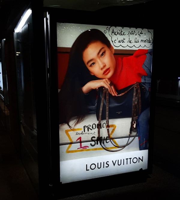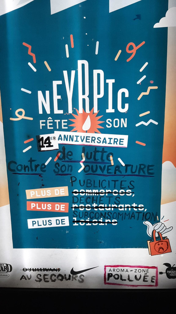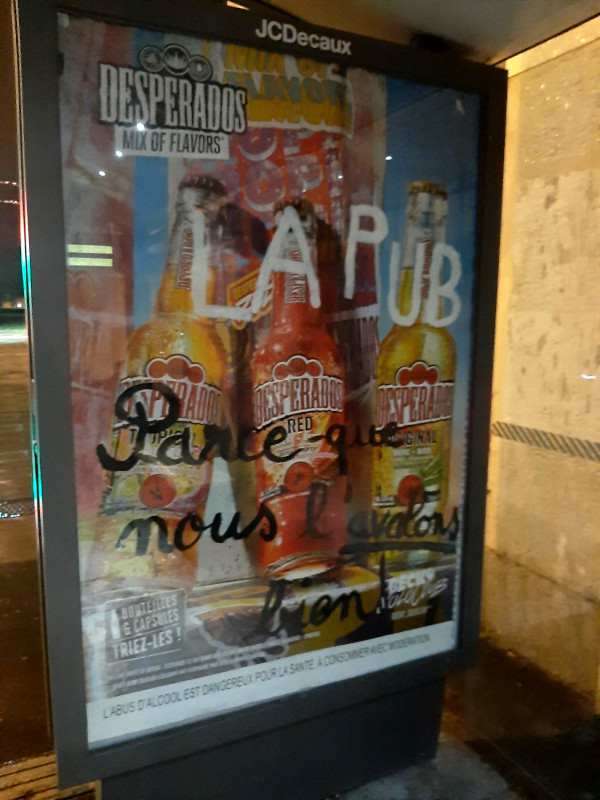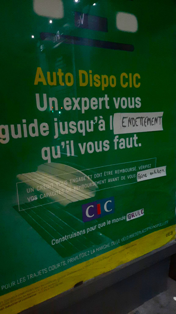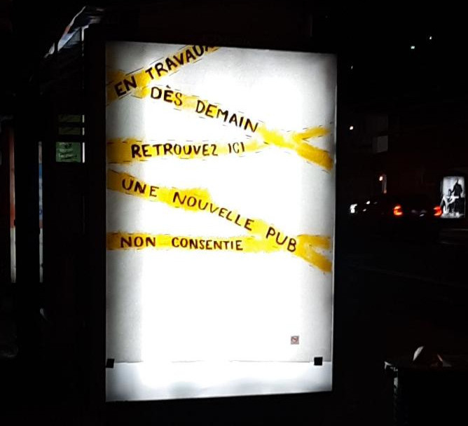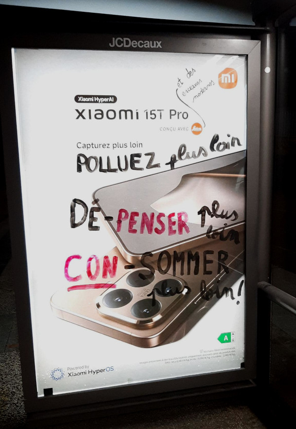 Customise your advert! We organised a workshop to repurpose paper advertisements that we had previously collected in the city. Participants repurposed advertising slogans and added comments to the ads in order to denounce the incitement to overconsumption, the promotion of problematic products and the omnipresence of advertising in public spaces. We then went out to display them. 19 November 2025, Grenoble, France