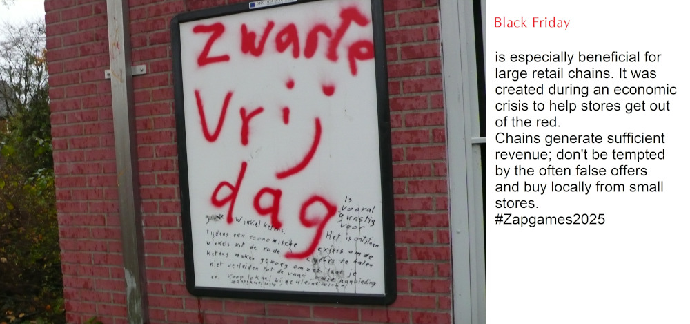 Brandalism against consumerism. With a small collective we are doing our version of brandalism removing and/or replacing as many advertisements as possible. We’re going for quantity and fun over quality. Our general message is against Black Friday! Informing people about the scam and that it is mostly big chain shops or online. Trying to convince people not to buy (new) or buy at their local shop. Or just have fun and remove some advertisement adding a funny sticker.