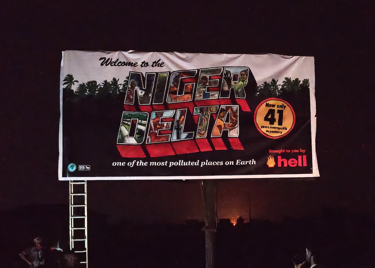 Billboard installed outside Port Harcourt in Ogoniland, Niger Delta. In the background of the night-time photo you can see the gas flare of a nearby oil refinery. Artwork and installation by artist Darren Cullen.