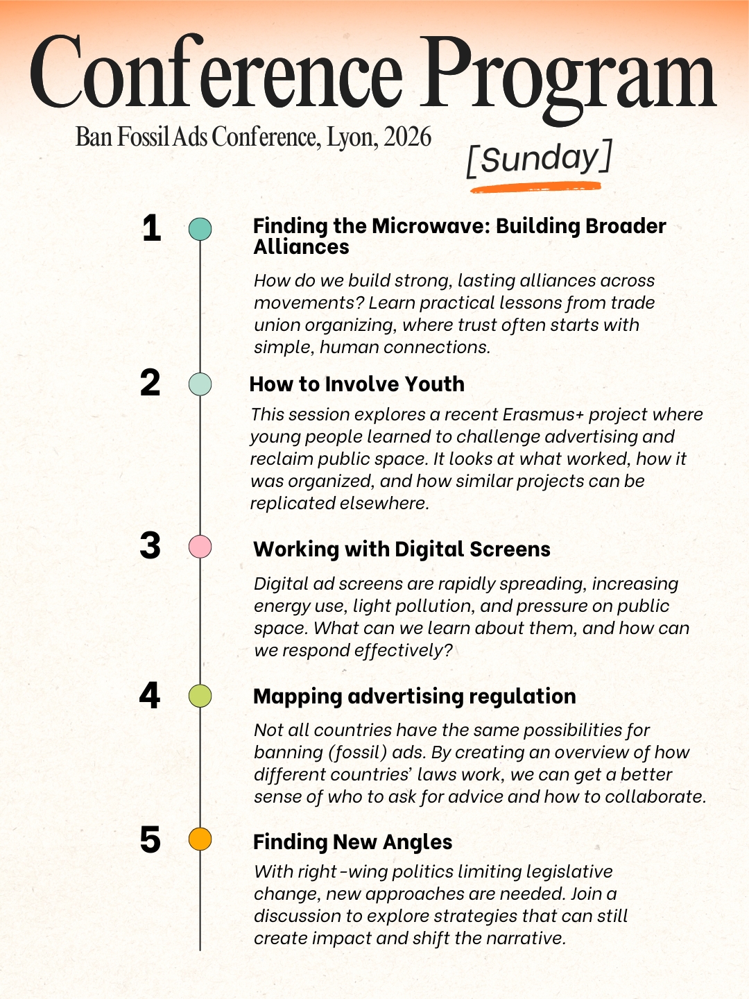 Join campaigners, residents and activists who are working to reduce the impacts of corporate advertising on our environment, our wellbeing, and our mental health, for 2 days of workshops, talks, strategizing and information sharing. We will discuss topics such as building broader alliances, fossil fuel sponsorships, working with digital screens, involving youth, archiving fossil ads, mapping European ad legislation, reaching the press with your campaign and more.