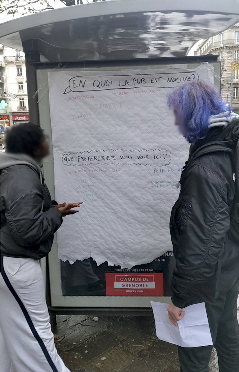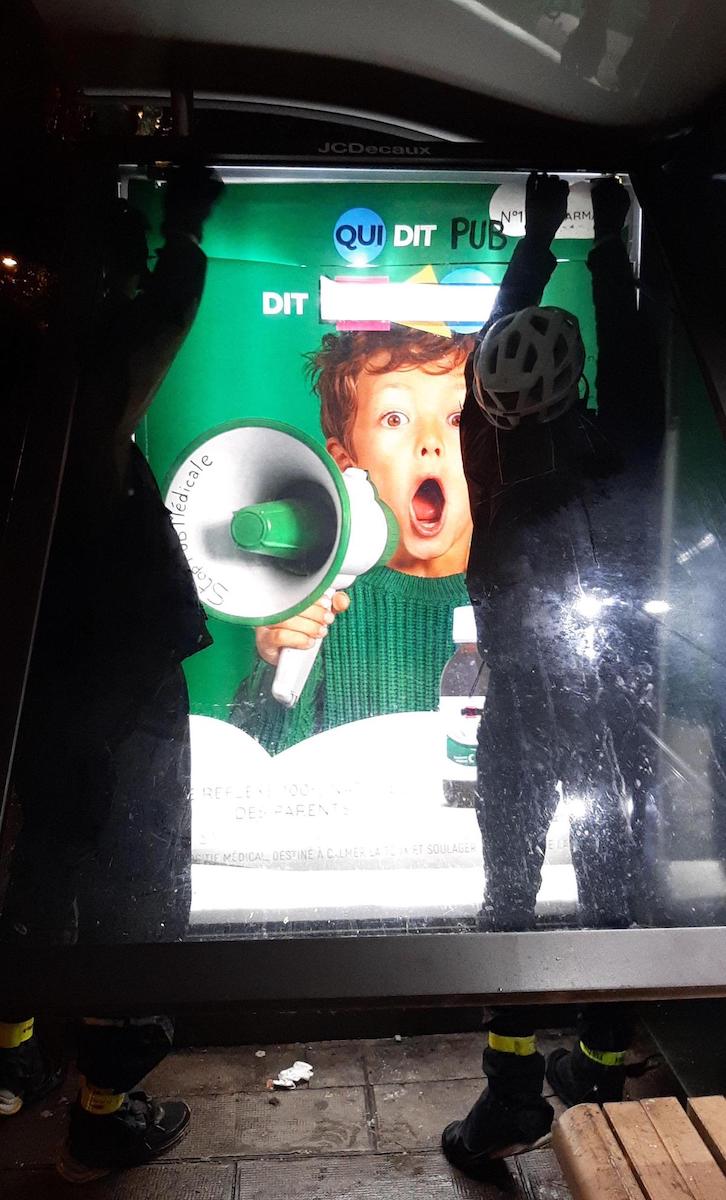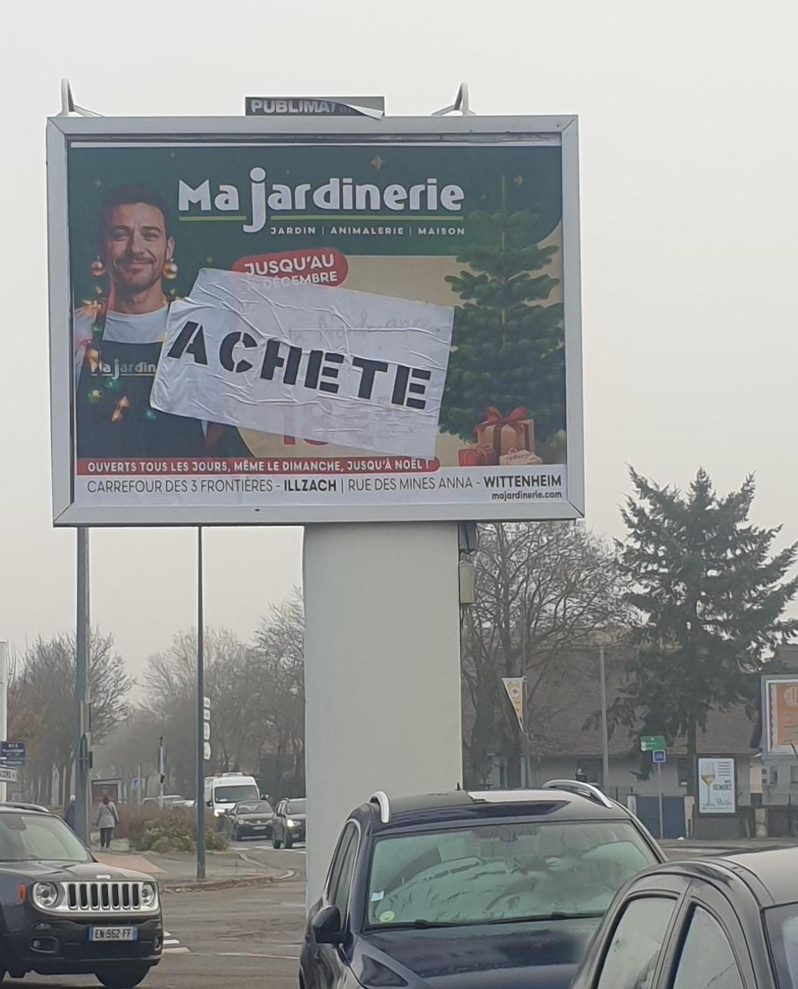 "Soon there will be a tree here...." Anti-advertising activists edit their local billboards in Mulhouse, France as part of the #ZAPGames2025 - 2 weeks of affinity group actions against Black Friday #consumerism. https://subvertisers-international.net/2025/11/soon-ici-bientot-un-arbre-mulhouse-france-zap-games-2025/